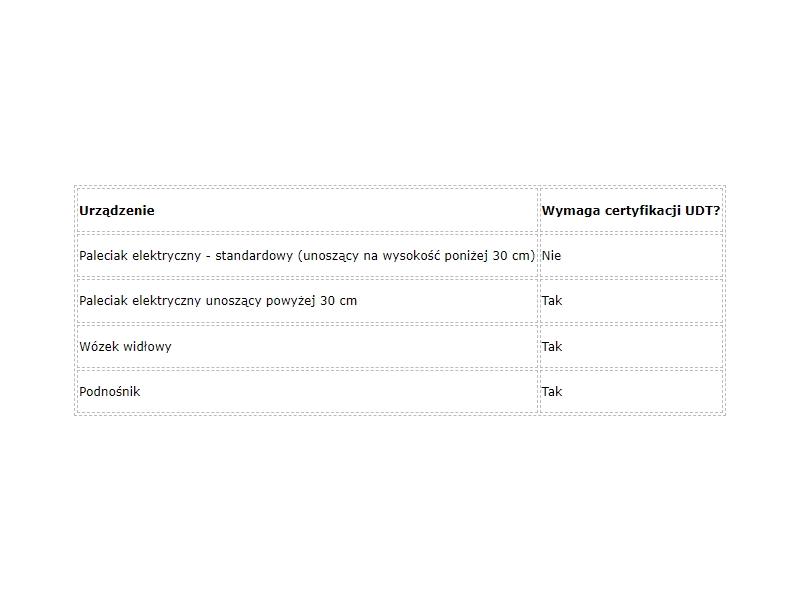 Niestandardowy paleciak elektryczny (unoszący na wysokość przekraczającą 30 cm) jest prawnie urządzeniem podlegającym kontroli UDT. Oznacza to, że: